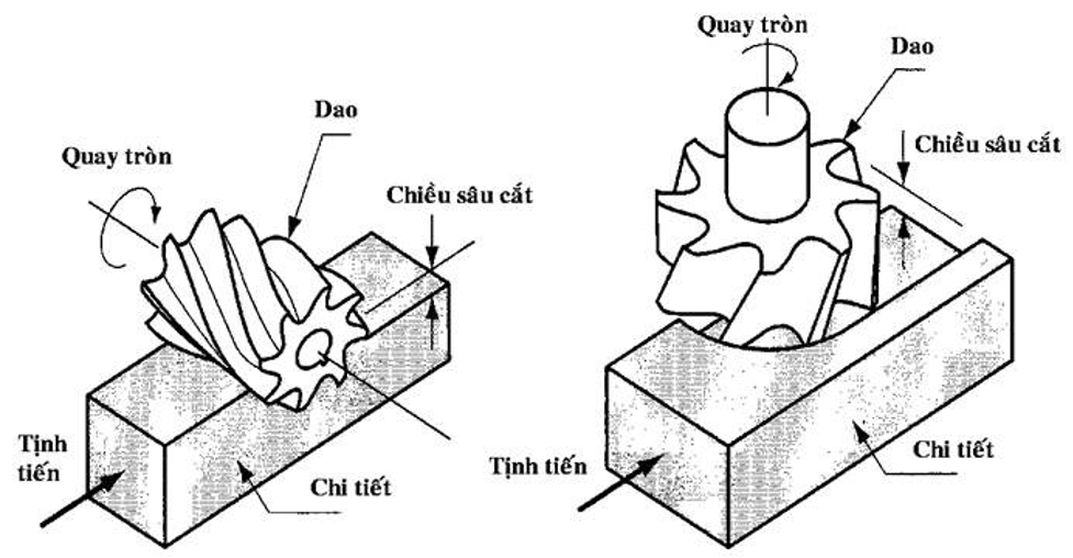 Ưu điểm của phương pháp này là năng suất và độ chính xác cao, dao phay có nhiều lưỡi cắt nên lâu mòn lưỡi, lượng chạy dao lớn. Đây cũng là phương pháp gia công an toàn cho người thợ vì phoi đứt đoạn