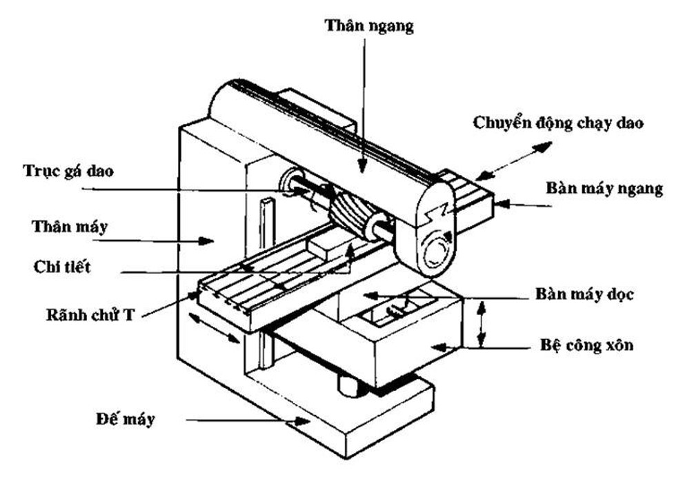 + Máy phay thân ngang: là loại máy phay có thân ngang phía trên thân máy
