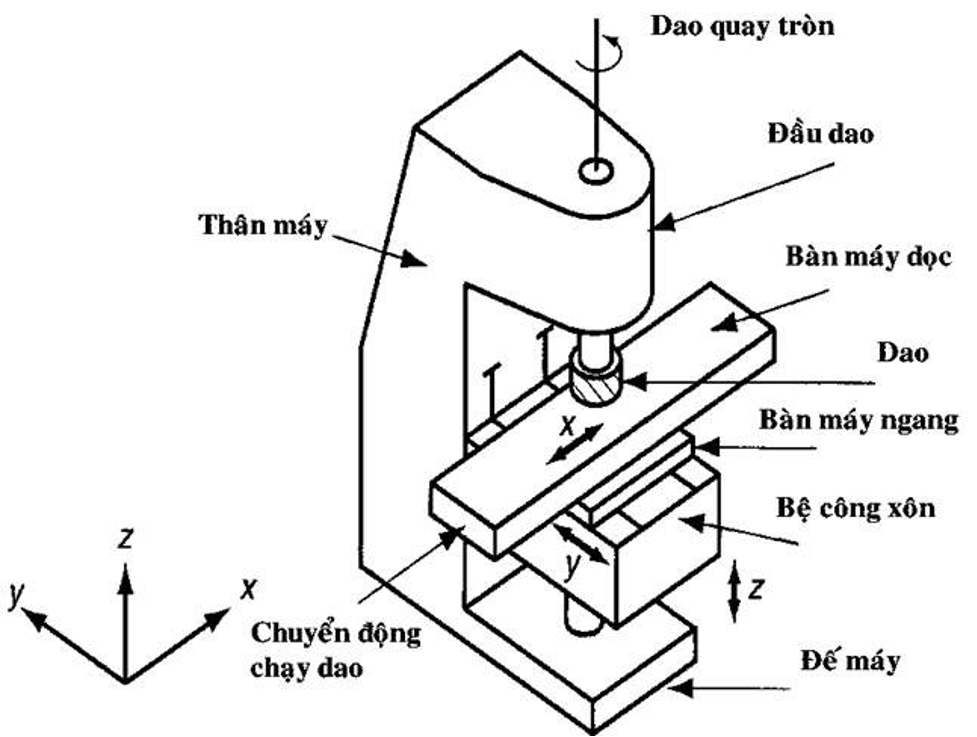+ Máy phay thân cố định: là loại máy phay có kết cấu bàn máy cố định, có nghĩa là bàn máy chỉ di chuyển theo chiều dọc và chiều ngang còn chiều đứng thì đầu dao di chuyển