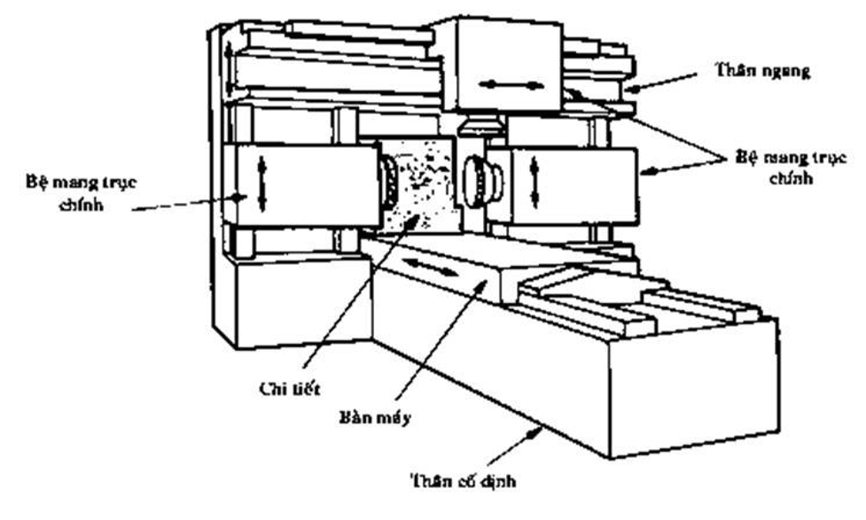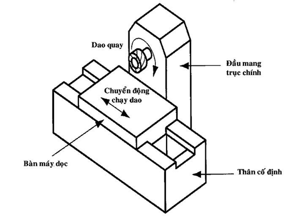 + Máy phay giường: là loại máy phay thân cố định loại lớn có các cổng trục ngang mang nhiều đầu dao
